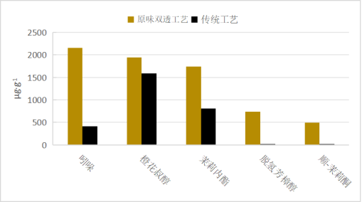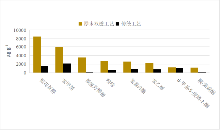 原味陈茶(3年陈肉桂),呈兰花香、果香的橙花叔醇相对含量最高,达到8516.3μg·g-1,占总量的16.1%,而传统3年陈肉桂中仅为1541.6μg·g-1;呈坚果、杏仁香的苯甲腈相对含量次之,达到6005.8μg·g-1,占总量的11.3%,传统3年陈肉桂中为2153.8μg·g-1;呈果香、蜜香的脱氢芳樟醇相对含量达到3553.3μg·g-1,占总量的6.7%,而传统3年陈肉桂中未检出;呈茉莉香、花香的吲哚相对含量达到2772.4μg·g-1,占总量的5.2%,传统3年陈肉桂中为672.1μg·g-1;呈典型茉莉香、花香的茉莉内酯相对含量达到2567.7μg·g-1,占总量的4.9%,传统3年陈肉桂中为848.7μg·g-1;呈清甜玫瑰花香气的苯乙醇相对含量达到2289.8μg·g-1,占总量的4.3%,传统3年陈肉桂中为772.6μg·g-1;呈清新柑橘香气的6-甲基-5-庚烯-2-相对含量达到1242.2μg·g-1,占总量的2.4%,传统3年陈肉桂中为1040.5μg·g-1;呈茉莉花香的-茉莉酮相对含量达到1210.1μg·g-1,占总量的2.3%,传统3年陈肉桂中未检出。原味陈茶(3年陈肉桂)丰富的花果香气成分橙花叔醇、苯甲腈、脱氢芳樟醇、吲哚、茉莉内酯、苯乙醇、6-甲基-5-庚烯-2-酮、顺-茉莉酮可占其香气总量一半以上(53.2%),共同构成其“花蜜香、花果香浓郁持久,品种香明显”的香气品质特点。