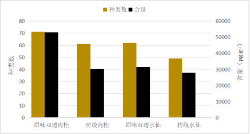 原味陈茶共检出107种香气成分,原味陈茶(3年陈肉桂)为71种、传统3年陈肉桂为61种、原味陈茶(5年陈武夷水仙)为62种、传统5年陈武夷水仙为49种。原味陈茶不仅香气类型丰富,香气总量也更高,原味陈茶(3年陈肉桂)香气总量为52842.2μg·g-1、传统3年陈肉桂为31454.2μg·g-1、原味陈茶(5年陈武夷水仙)为30279.5μg·g-1、传统5年陈水仙为27977.4μg·g-1